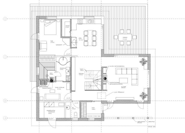 We made the house project ourselves. It was important to us that the house was planned in such a way that the terrace gets as much sun as possible during the day. It was also important to have a sauna inside the house.